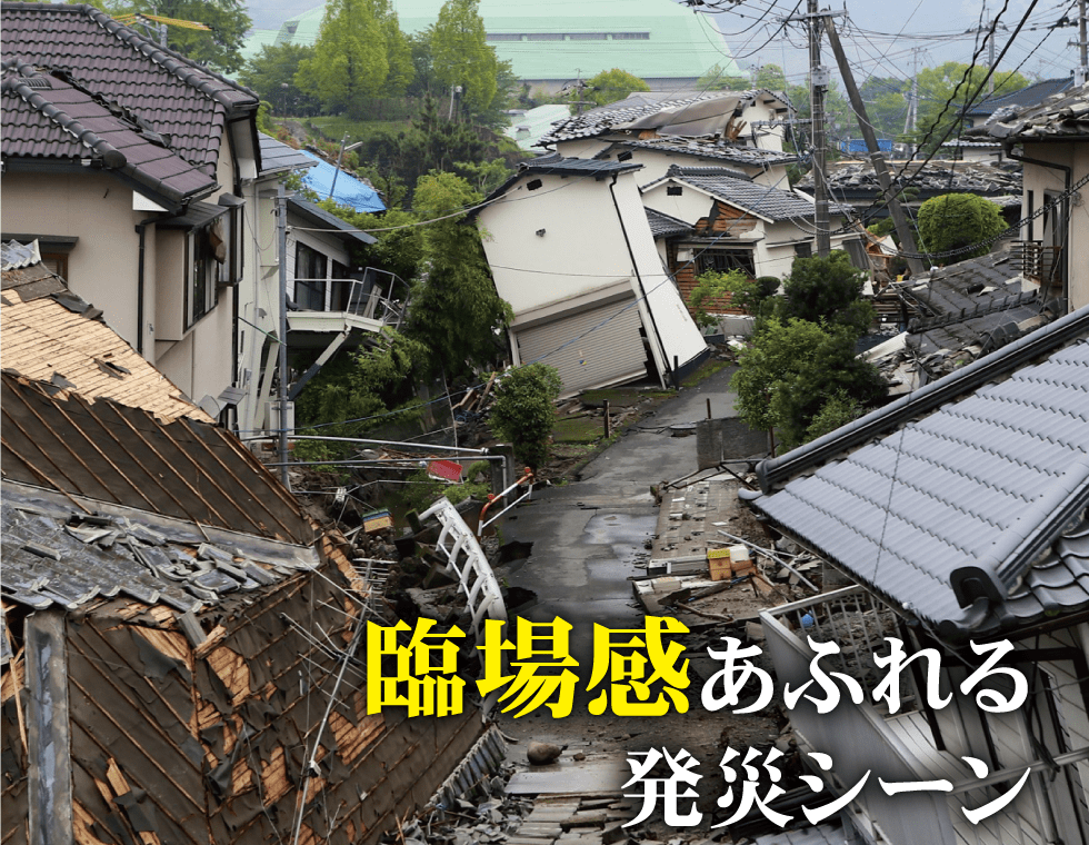 体感型 防災アトラクション®に盛り込まれた『焦り』『混乱』『不便』という要素を継承しつつ、発災時の臨場感ある状況をWEB上の再現ドラマにて追体験。自宅にいながら、仲間や家族で学べる機会となります。