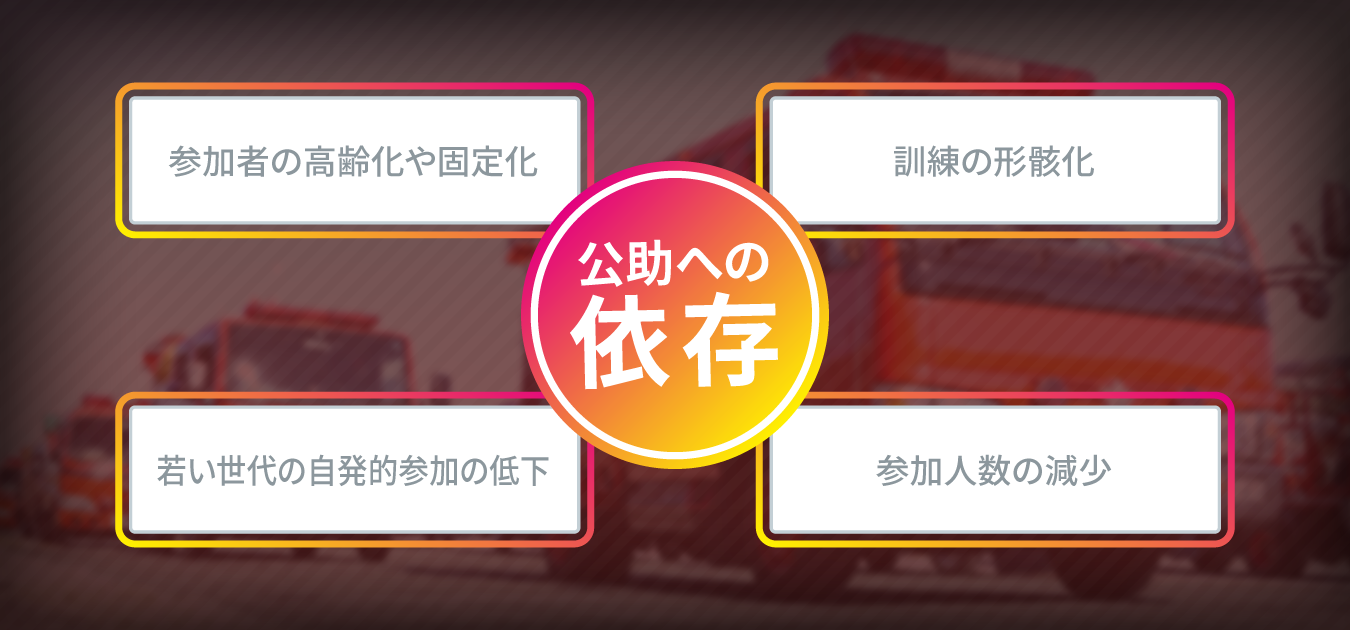 災害に備えて各地で様々な訓練・研修が⾏われていますが、その現場では 『参加者の⾼齢化や固定化』『訓練の形骸化』『若い世代の参加の低下』『参加⼈数の減少』といった課題 が全国的に挙げられています。そして依然 として『公助への依存』傾向が⾒受けられると共に災害への「備え」をしていない⼈々も多く存在しています。これまでの災害の現場より「公助の役割と限界」を知ると共に「⾃助⼒の強化」「共助という備え」が急務であると我々は考えています。