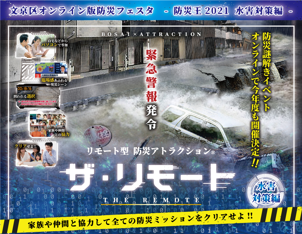 | 文京区オンライン版防災フェスタ -防災王2021- リモート型防災アトラクション® ザ・リモート 水害対策編 |