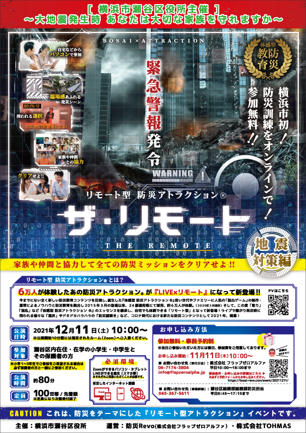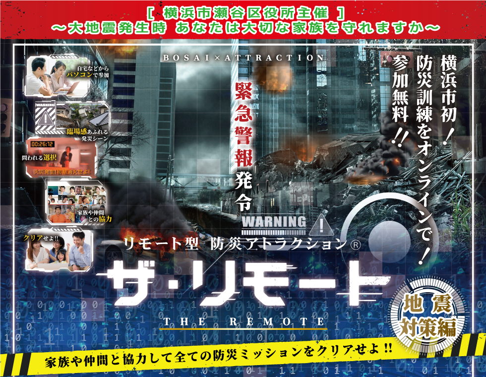 『防災教育』×『エンターテーメント』を融合し、体育館や大型ホールなどで映像・音響・照明などを駆使し、臨場感ある災害現場を再現。迫り来る制限時間内で、家族や仲間と共に協力し合い、安全確保を目指す『脱出アトラクション』のスタイルを採用し、2015年3月に登場以来24都道府県にて開催、約6万人以上の動員となった人気の防災コンテンツに遂に『リモートバージョン』が登場‼